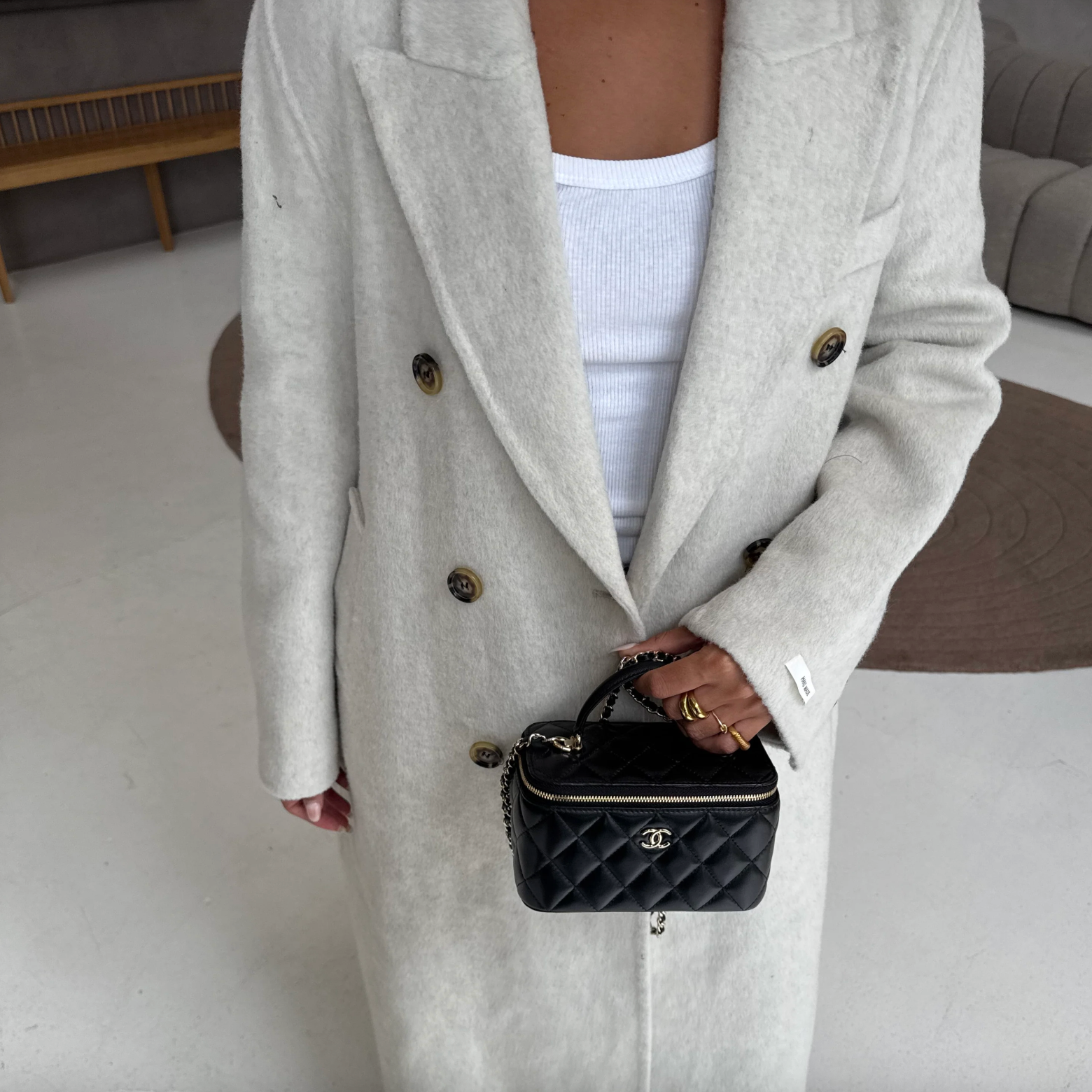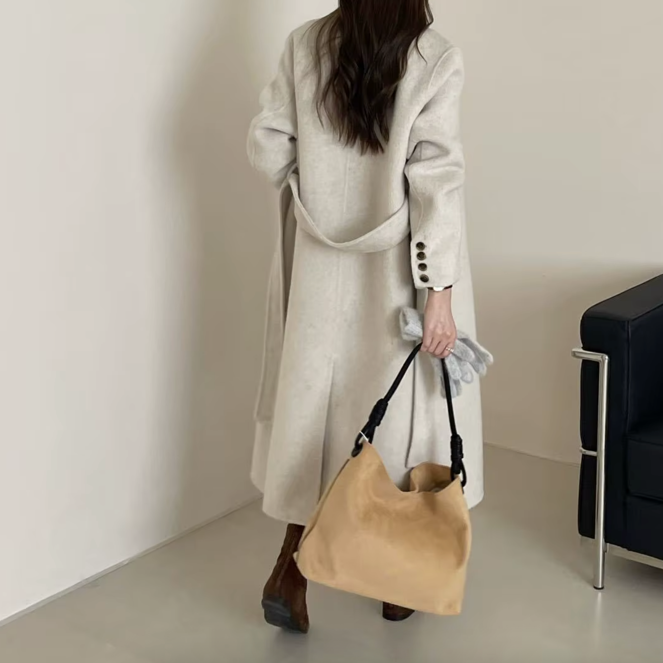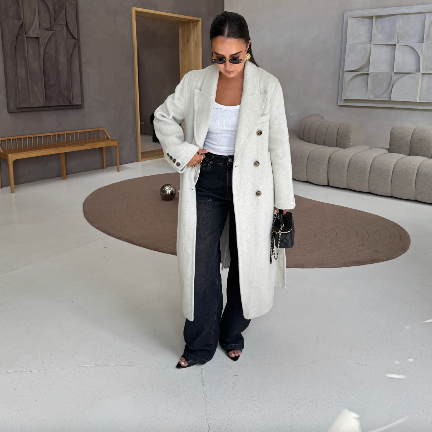 Sa coupe longue et structurée accompagne la silhouette sans la figer.