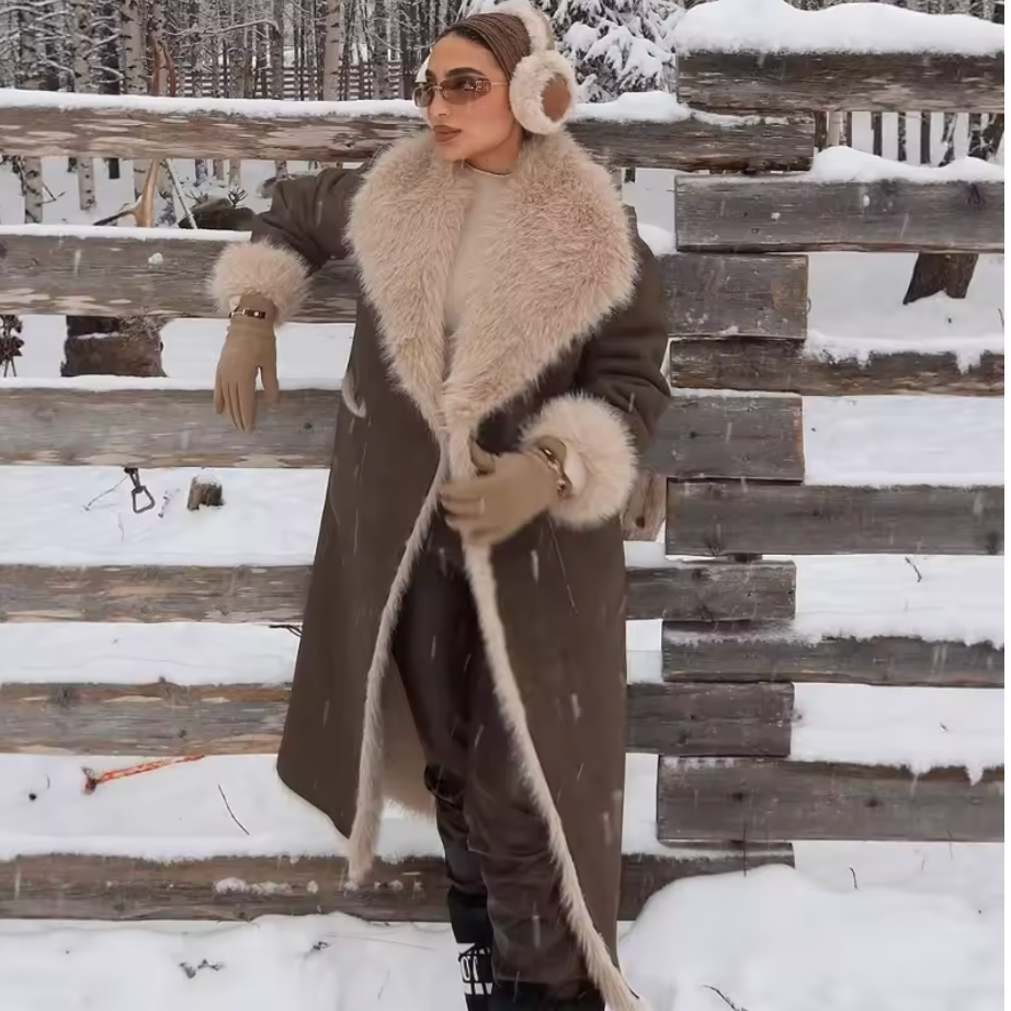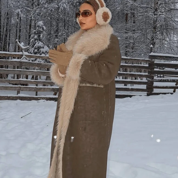 Les finitions ton sur ton, le col large à revers, et les bords délicatement doublés de fourrure ajoutent une profondeur visuelle unique — une allure à la fois vintage et contemporaine.