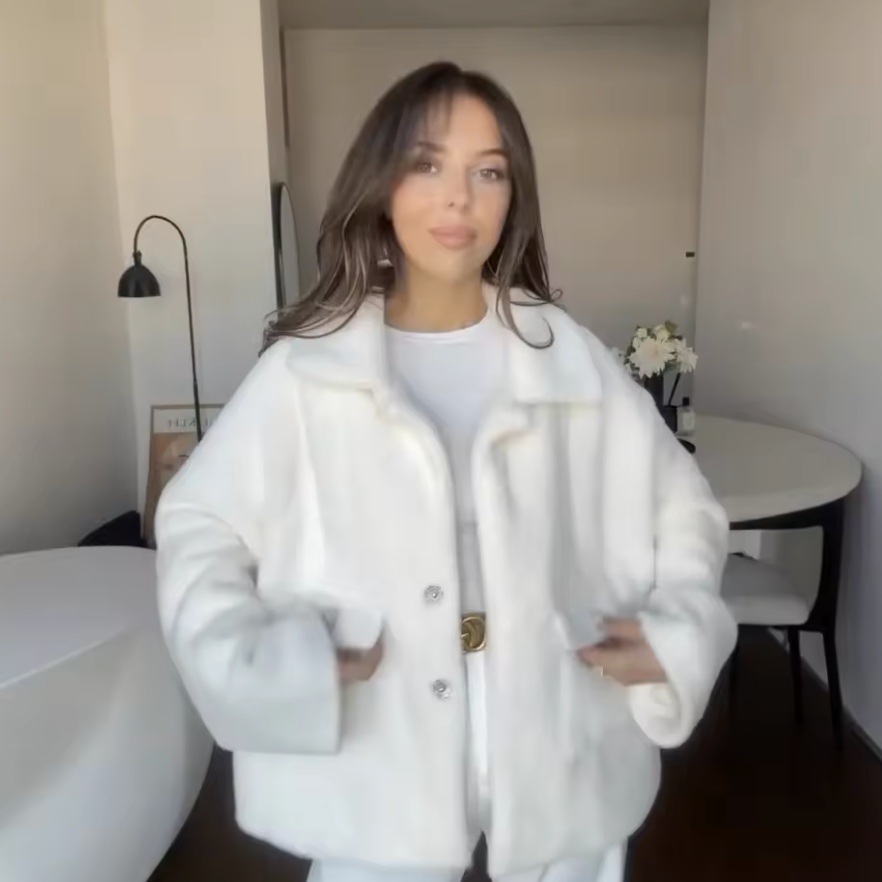Les boutons ton-sur-ton ajoutent une touche subtile de sophistication, tandis que la coupe légèrement oversize crée une allure à la fois moderne et décontractée.
